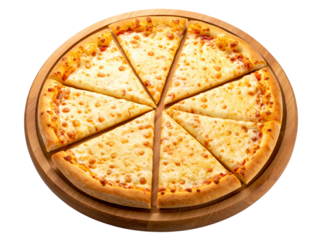 liced Cheese Pizza Pie on Wooden Board, Angled Side View, Isolated