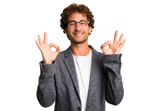 Young curly smart caucasian man cut out isolated cheerful and confident showing ok gesture.