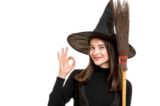Young caucasian woman dressed as a witch holding a broom isolated cheerful and confident showing ok gesture.
