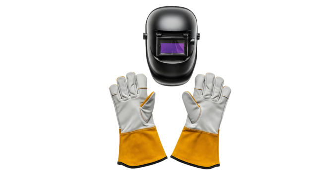 Welding helmet and protective gloves, essential safety gear for welders, isolated on a white background