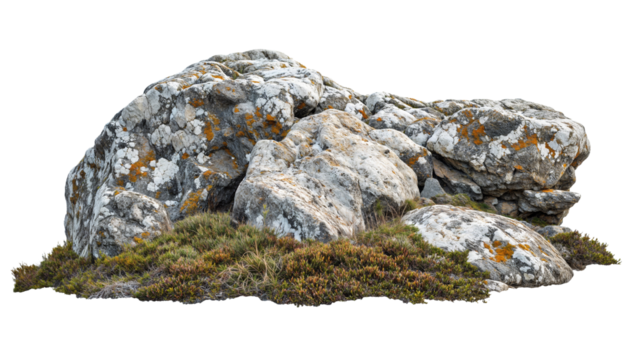Large tundra rock formation with moss and lichen isolated on a transparent background