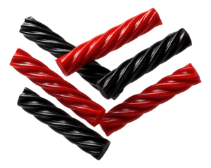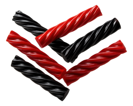 Red and black licorice twists with a shiny, textured surface.