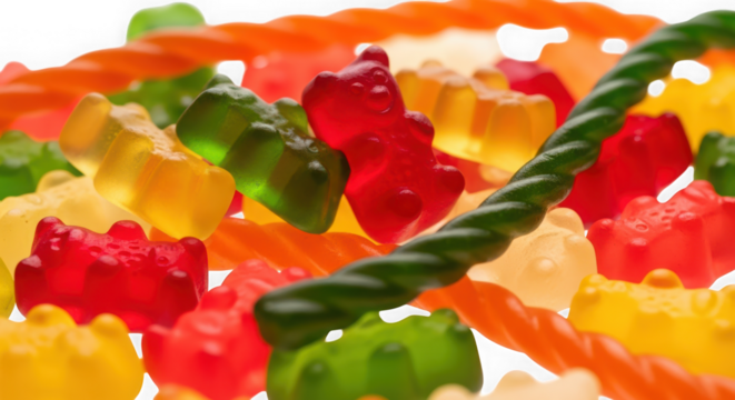 A vibrant assortment of colorful gummy bears and twisted licorice strings scattered on a transparent background, creating a playful and sweet composition