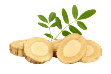 Sliced Licorice Root and Green Leaves on Background glycyrrhiza glabra herbal isolated on a transparent background