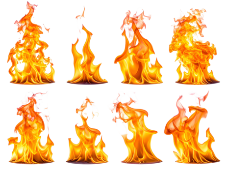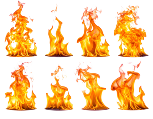 An intense display of flames in vibrant orange and yellow hues, dancing energetically against a transparent background, ideal for adding dramatic effects to various designs.