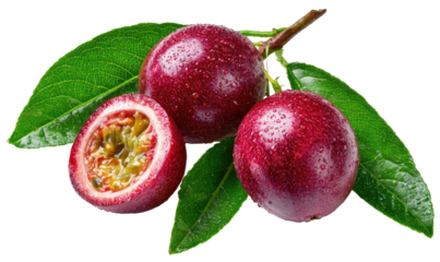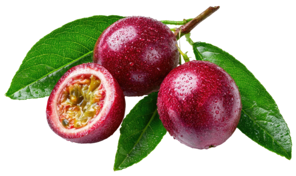 Vivid still life of passion fruits, displaying color variations and internal pulp