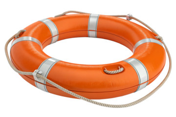 Bright red lifebuoy ring with white straps isolated on transparent background