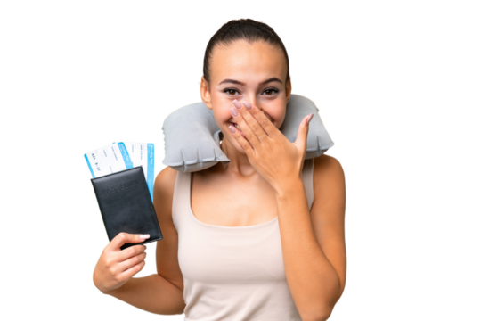 Young Arab woman with Inflatable Travel Pillow over isolated background happy and smiling covering mouth with hand