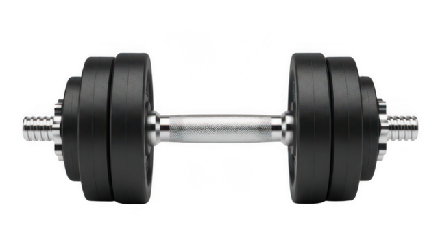 Shiny chrome dumbbell with adjustable weight plates for fitness training. Isolated on transparent background, png