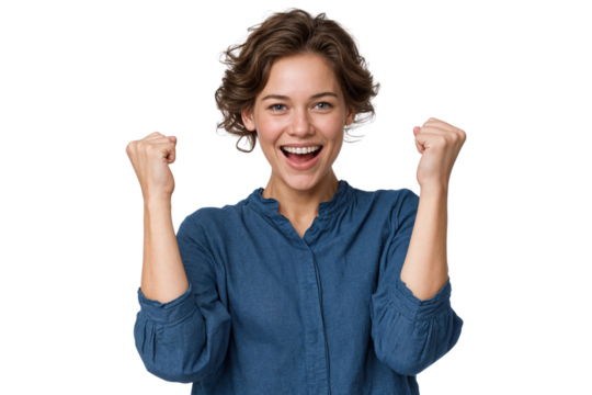 A young woman with curly hair cheers with excitement, celebrating success with fists clenched, isolated on transparent background