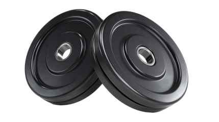 Pair of smooth barbell plates with matte elastomer surface, clean center bores and minimal detailing, isolated on transparent background.