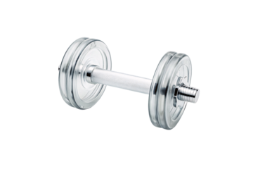 Adjustable chrome dumbbell with clear glass plates and metal threading system, isolated on a transparent background