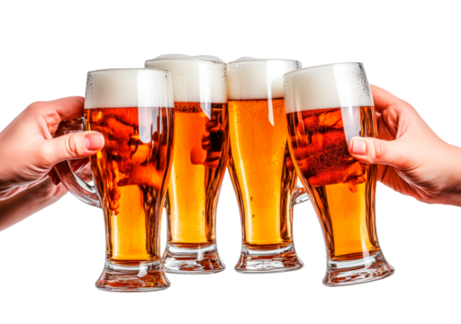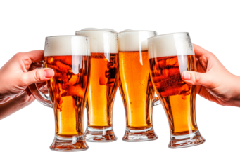 Friends celebrating with raised beer mugs isolated on transparent background