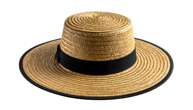 A straw hat with a black band and brim, isolated on a black background