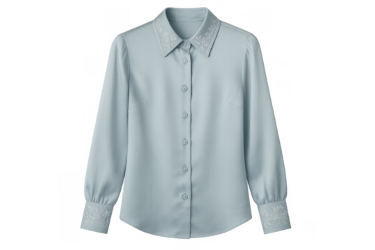 Elegant light blue women's blouse featuring long sleeves, a pointed collar, and cuffs with intricate white embroidery. Transparent background