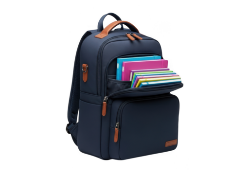 A navy blue backpack with brown leather accents, open to reveal colorful notebooks and folders