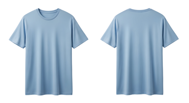 Plain light blue t-shirt showing front and back views with round neckline and short sleeves for product mockup purposes on transparent background
