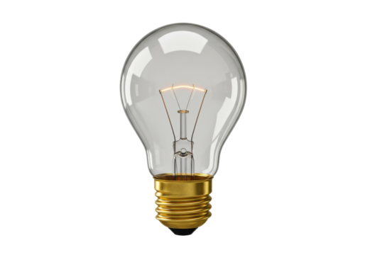 Classic incandescent light bulb isolated, clear glass bulb with golden base for vintage lighting and energy concepts