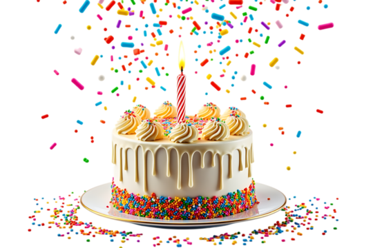 birthday cake with lit candle and colorful confetti isolated on transparent background