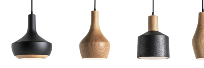 Collection of five modern ceiling pendant lights with diverse designs black white and blue transparent background