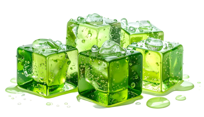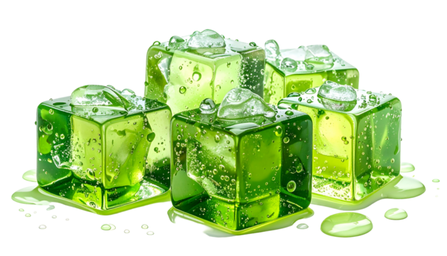 Close-up of vibrant green gelatin cubes with water droplets and spill