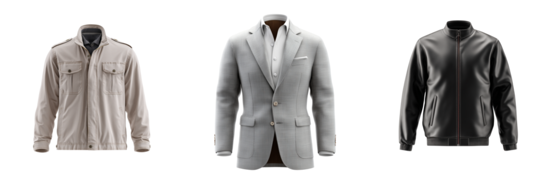 Three men's jackets and a suit jacket displayed side by side isolated on a transparent background blazer
