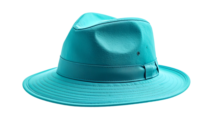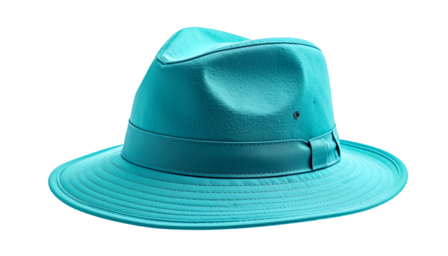 A vibrant turquoise fedora hat with a pinched crown and a structured brim, isolated against a black background. The light creates shadow