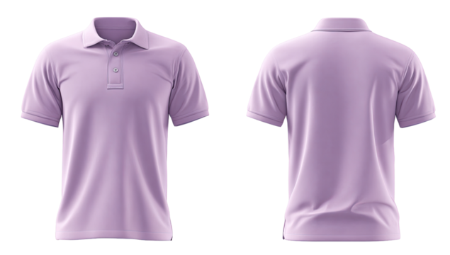 Front and back view of a light lavender polo shirt.  Short sleeves, collared, and button closure.  Plain design