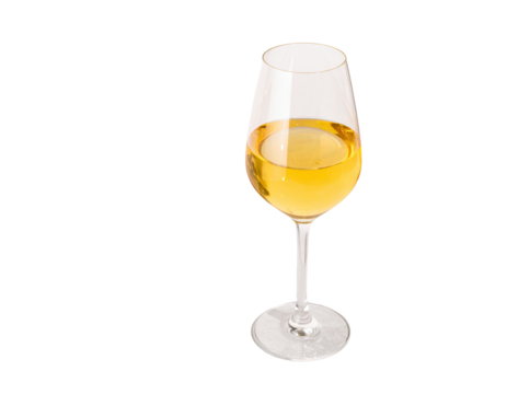 White Wine Glass with Golden Liquid and Light Refraction  Angled Perspective Isolated on Transparent Background PNG