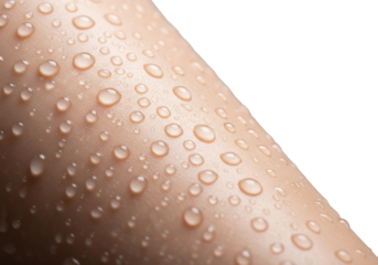 UHD macro shot of a female leg segment with exceptionally smooth, moisturized skin and clear water droplets, softbox lit against a transparent background, pristine purity concept