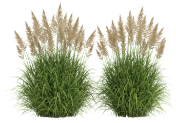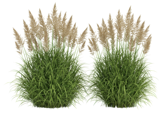 Isolated lush green ornamental grass clumps with vibrant blades and delicate feathery light brown flower spikes, on a pristine seamless transparent background, concept for botanical design elements
