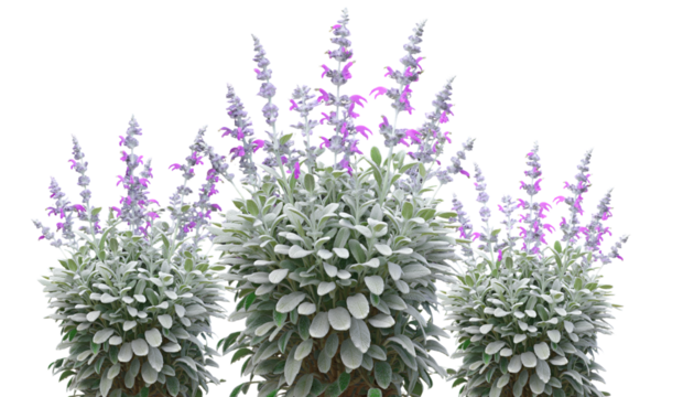 Three lavender plants with gray-green foliage and light purple flower spikes are visible against a bright white background PNG