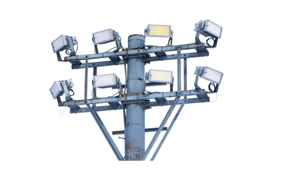 Large spotlight pole isolated on cut out PNG or transparent background. It is technology that provides light in wide area. Beautifully shaped set in park to illuminate night. Safety on roads or park