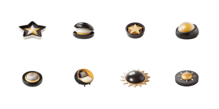 Collection of eight stylized three dimensional black and gold icons representing celestial and furniture themes on transparent background