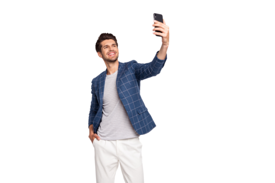 Portrait of his he nice attractive lovely stylish cheerful cheery freelancer busy body wearing blue checked blazer taking making selfie isolated over light white pastel background