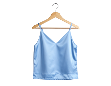 A silky light blue spaghetti strap camisole or tank top hangs neatly from a wooden coat hanger.