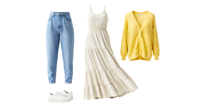 Outfit Laydown Featuring Light Blue Jeans White Sneakers Dress and Yellow Knit Cardigan PNG