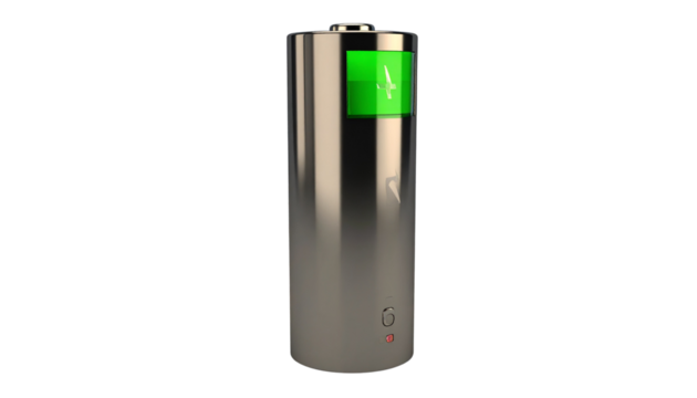 Modern rechargeable battery with shiny metallic finish and vibrant green indicator showing full power, perfect for technology, innovation, and sustainable energy concepts isolated on solid white Png