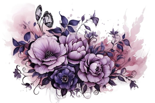 Periwinkle violet anemone, dark purple rose, dusty mauve and lilac hyacinth, allium, white peony, isolated on PNG Background. Generative Ai.