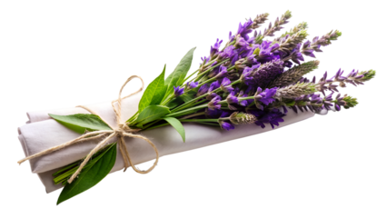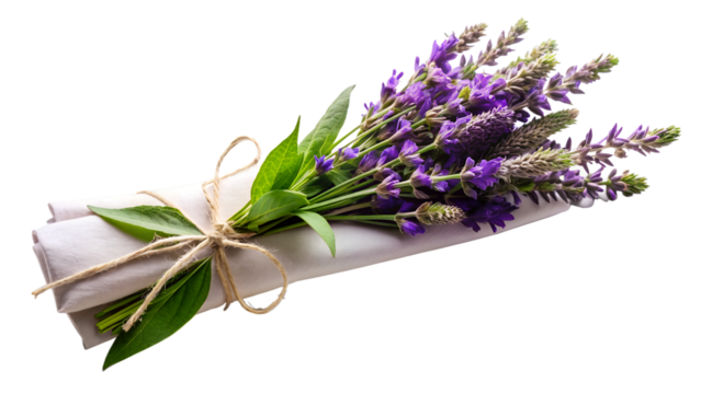 a beautiful bouquet of salvia flowers with green leaves, wrapped in white paper and tied with natural twine