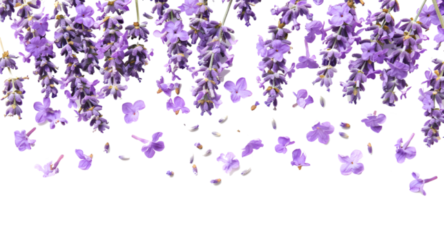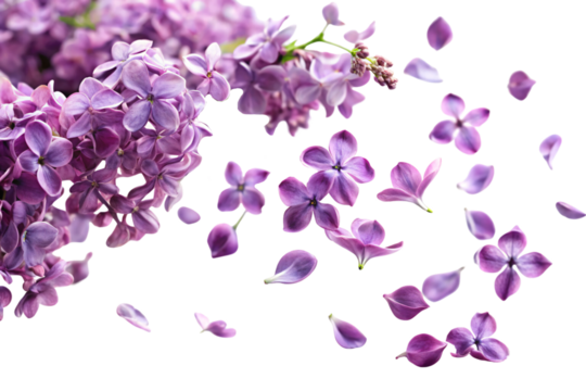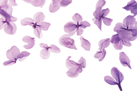 A cluster of vibrant lilac flowers with individual petals floating around, giving a dynamic and delicate floral arrangement against a transparent background