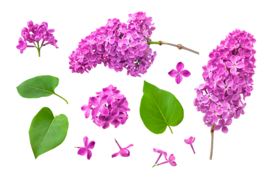Pink purple lilac flower branches, inflorescences, buds, green leaves isolated on white background. With clipping path. Floral set, elements for design, postcards, congratulations
