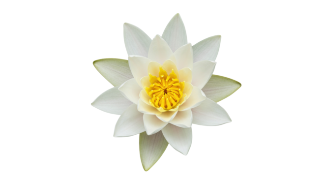 Elegant water lily flower isolated PNG, pristine white petals and vibrant yellow center on transparent backdrop for design projects