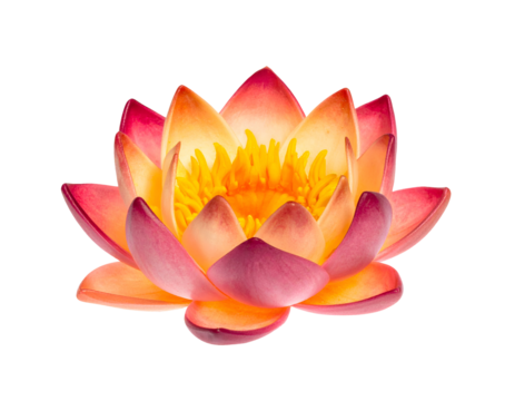 A beautiful, vibrant fantasy lily flower with purple, orange, and pink petals, isolated on a white transparent background PNG