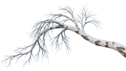 Snowy winter branches with leaves, icy tree limbs, frozen nature scene, seasonal decoration, isolated on transparent background