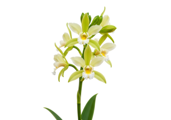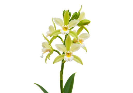 Vibrant pale yellow and lime green orchid blossoms, detailed and captivating, against a stark black backdrop, showcasing the flower's delicate petals and intricate structure.