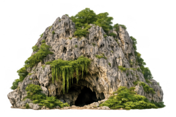 Limestone karst mountain with a cave entrance, covering rock formations with green foliage and hanging vines, transparent background