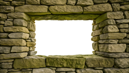 Moss-covered limestone wall with arched stone lintel and rustic rectangular opening, isolated on a transparent background