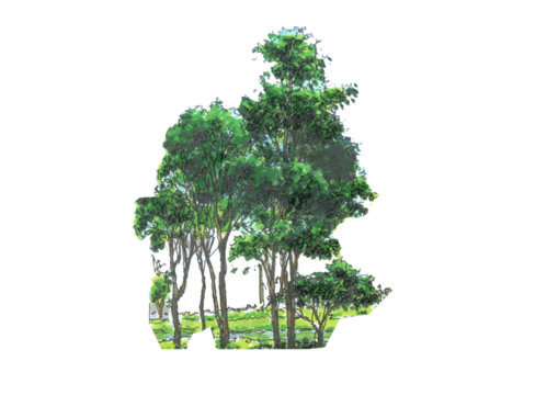Lush green trees and shrubs form a dense, horizontal line against a black background.  Various shades of green foliage create a natural border