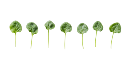 A series of fresh, green leaves arranged in a line showcasing their vibrant hue against a clean white background.